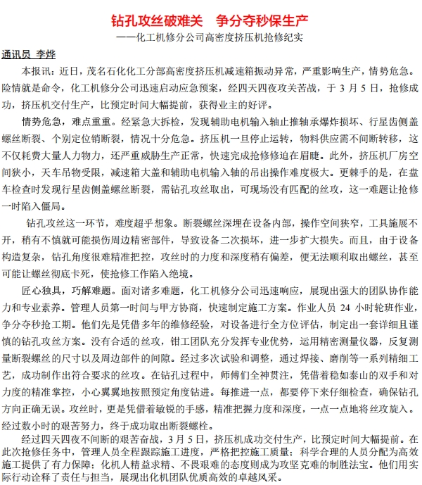 化工機(jī)修分公司高密度擠壓機(jī)搶修紀(jì)實