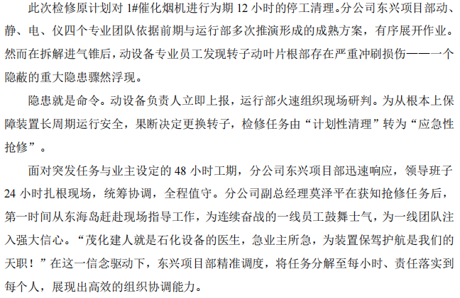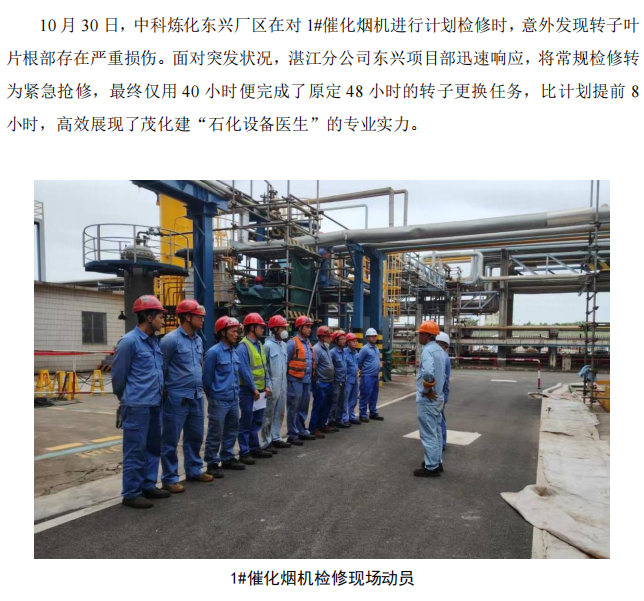 湛江分公司東興項(xiàng)目部:疾速 40 小時(shí),打贏中科煉化催化煙機(jī)搶修攻堅(jiān)戰(zhàn)