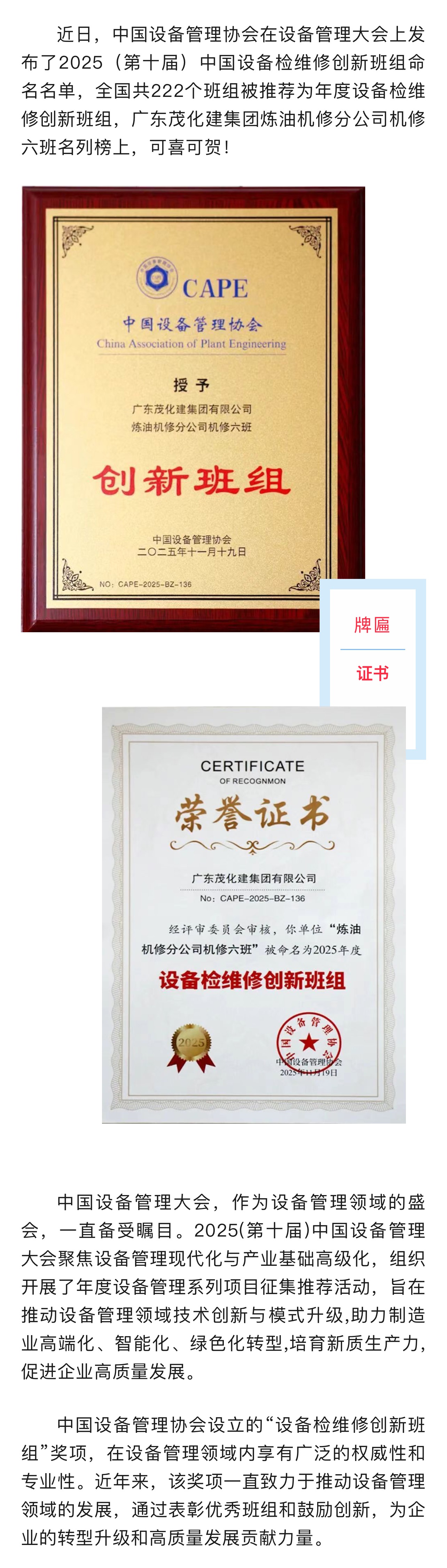 喜報 | 煉油機修六班榮獲全國”設備檢維修創(chuàng)新班組“稱號